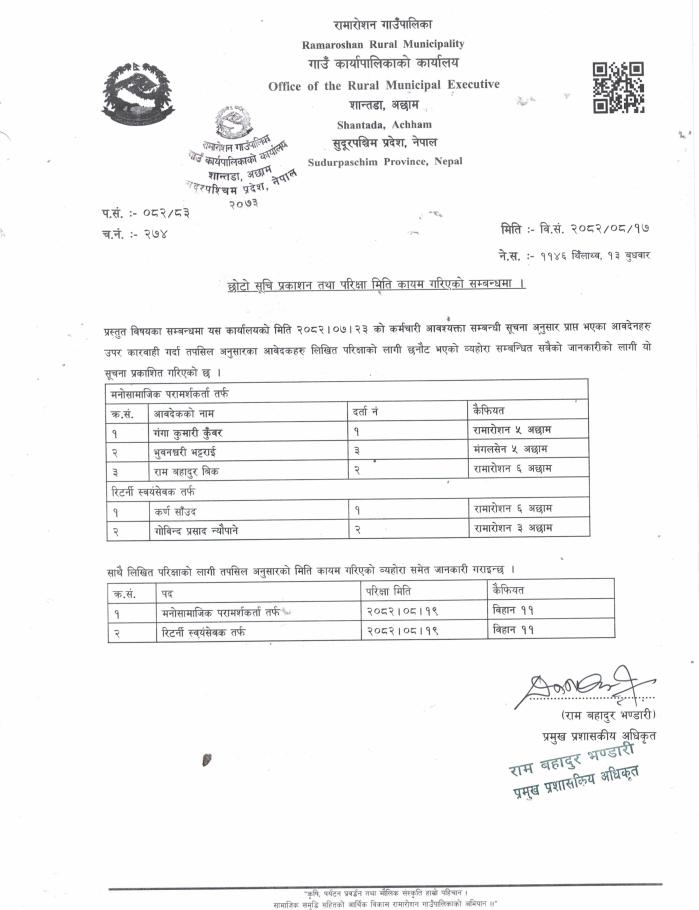 छोटो सूचि प्रकाशन तथा परिक्षा मिति कायम गरिएको सम्बन्धमा ।