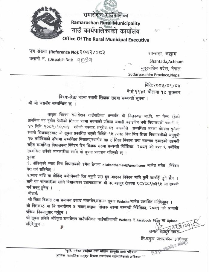 रिक्त पदमा स्थायी शिक्षक सरुवा सम्बन्धी सूचना ।।